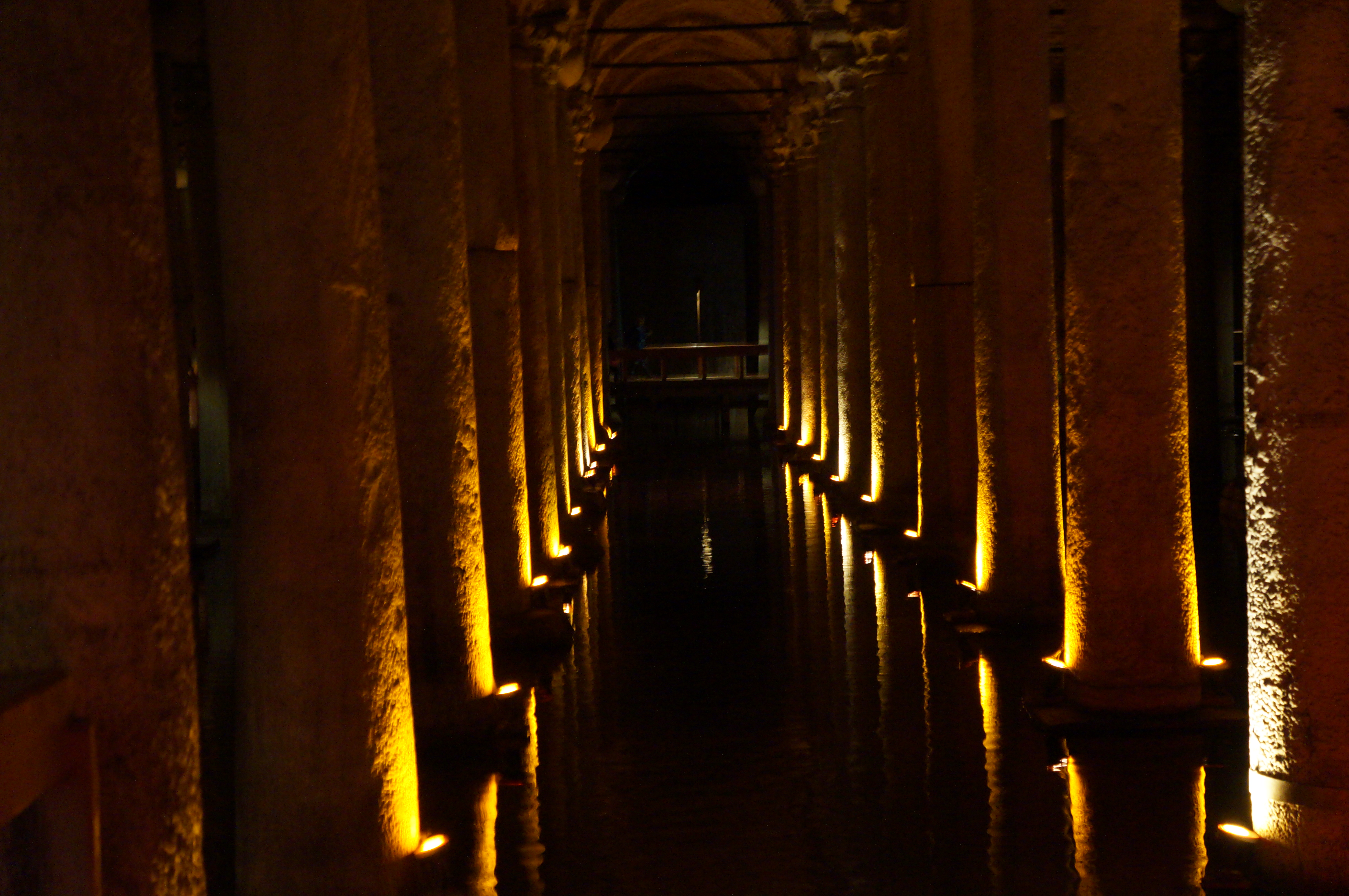 Basilica Cistern, built during the 6th century. The ceiling is supported by columns recycled from the ruins of older buildings.